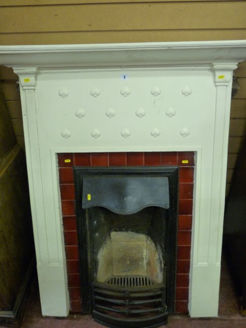 AN EDWARDIAN CAST IRON BEDROOM FIREPLACE AND SURROUND TOP MANTEL SHELF with lower bead and heart decoration, inset glazed red tiles, cast surround basket and clay fire back, 126 x 107 cms