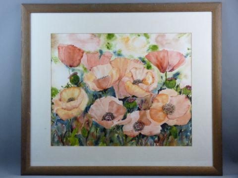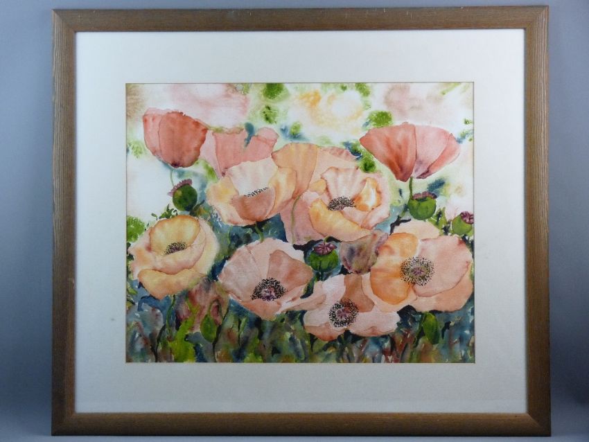 JOE HALDANE watercolour - vibrant study of a group of pink poppies, with artist's initials and title verso and biographical notes, 51 x 63 cms