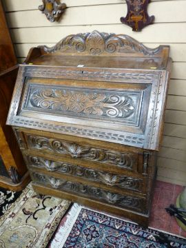 A LATE VICTORIAN CARVED FALL FRONT BUREAU with gallery top above a chamfered panel fall, the interior with a part arrangement of pigeonholes and drawers, the lower section with three further drawers deep carved with mask pulls, on a plinth base, 110 cms high, 89 cms wide