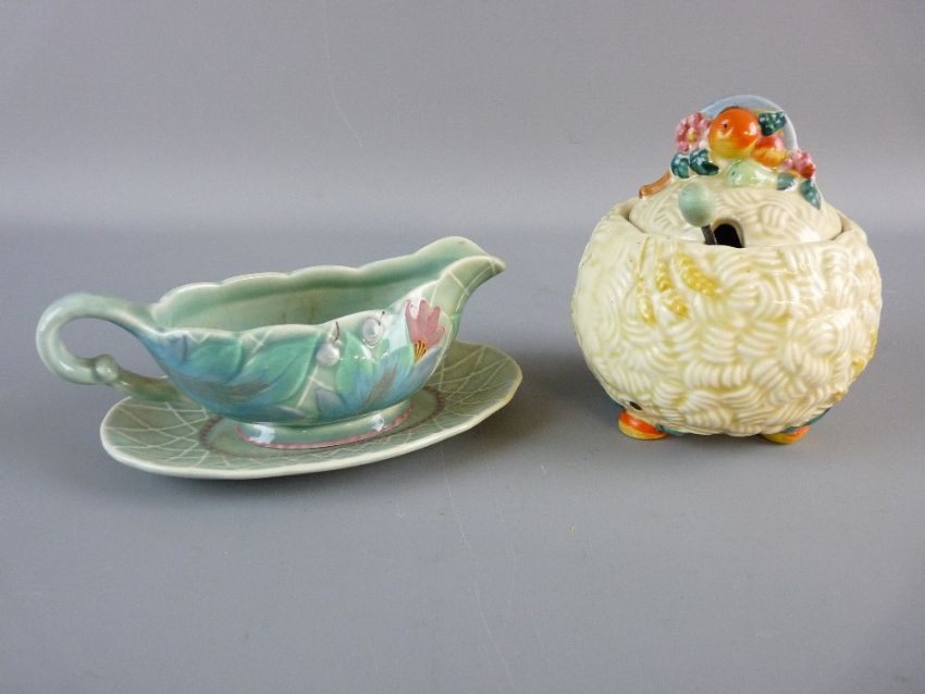 A CLARICE CLIFF POTTERY SAUCE BOAT AND TRAY having a floral and basket weave pattern in relief, marked to the base 'Clarice Cliff, Newport Pottery Co, England, no. 40A', (tray stained) and a Newport Pottery 'Celtic Harvest' honeypot and lid with a hallmarked silver berry spoon