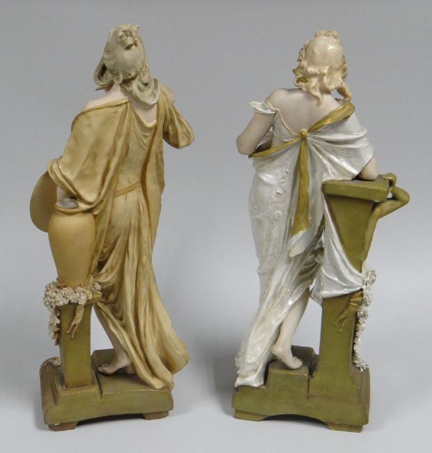 A PAIR OF ERNST WAHLISS TURN WIEN CERAMIC ART NOUVEAU FIGURES in the Classical style, one a standing lady artist with paint brush and artist's palette against a pedestal urn, the other in a lustrous robe holding a bust against a figural pedestal, both on matching bases, 53cms and 51cms high