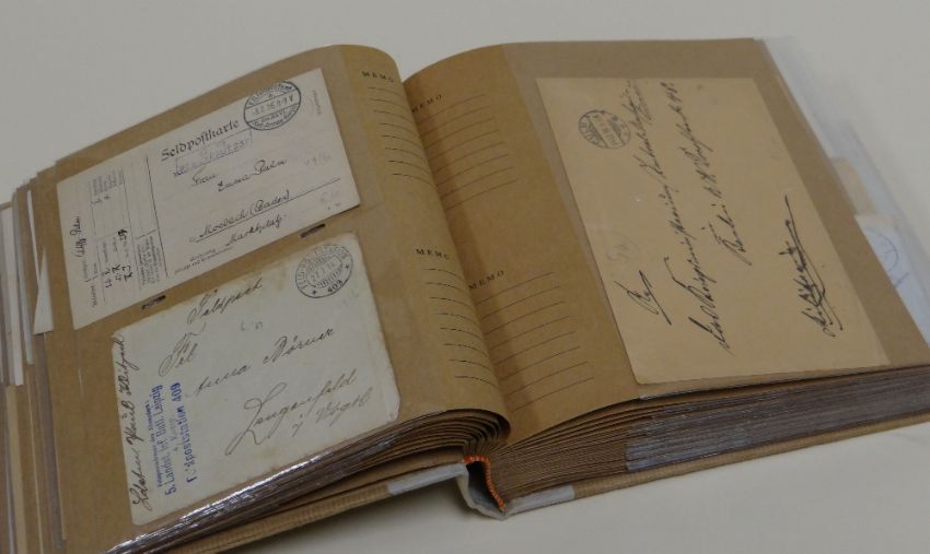 AN ALBUM OF ASSORTED WWI & WWII POSTCARDS, FIELD TELEGRAMS and other related items with approx 55 postcards, 37 field post envelopes, four post marks and stamps, ten photographs, a Red Cross prisoner correspondence, an Iron Cross letter etc