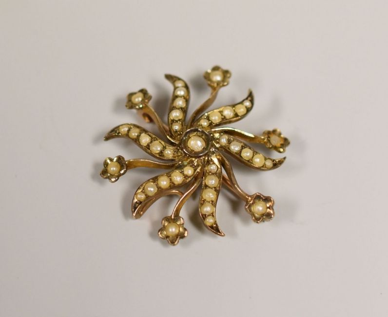 A GRADUATED ROW OF PEARLS WITH TWO 9CT CLASPS together with a 9ct seed pearl brooch
