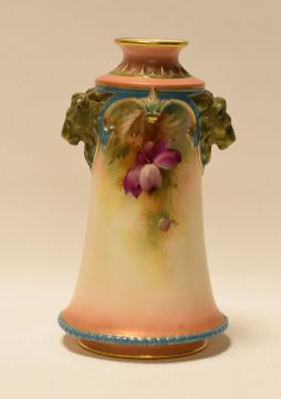 A HADLEY WORCESTER TAPERED VASE with twin lion-head handles and painted with flowers, 14cms high