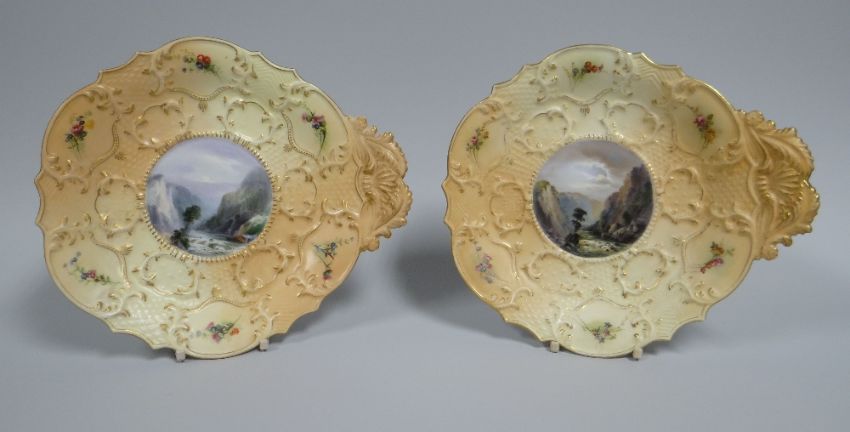 A PAIR OF ROYAL WORCESTER DISHES moulded with foliate handles and foliate borders featuring painted centre cameos of river scenes surrounded by painted floral sprigs to 24cms wide
