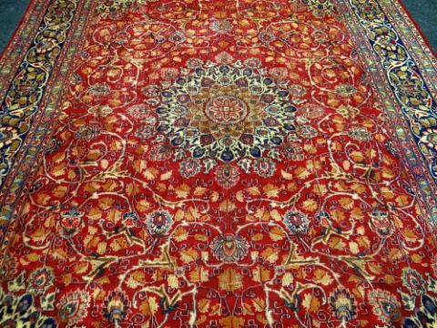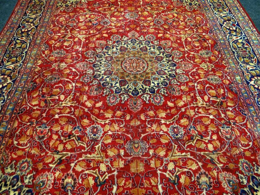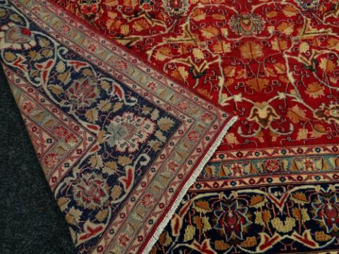 A LARGE OLD RED GROUND PERSIAN KASHAN CARPET with a shabaz medallion design, 388 x 294cms