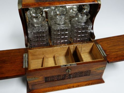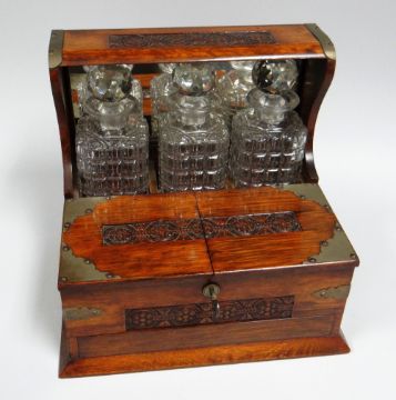 A CARVED OAK TANTALUS & CIGAR BOX with metallic mounts and a trio of hob-nail cut decanters with stoppers