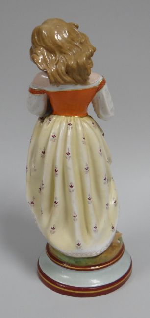 A LARGE CONTINENTAL PORCELAIN FIGURE OF A GIRL looking adoringly at a kitten she is holding in pastel glazes and with floral hem to her dress, no factory marks, 38cms high