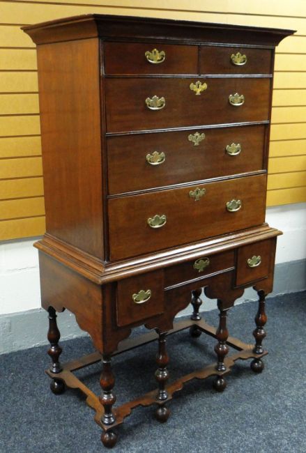 A NINETEENTH CENTURY OAK CHEST-ON-STAND, the top with three graduated drawers below two short, the base with an arrangement of three drawers above a shaped apron and with six baluster supports and shaped stretcher, brass escutcheons and handles, 159cms high