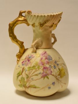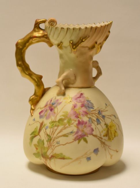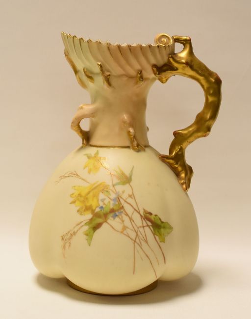 A ROYAL WORCESTER BLUSH IVORY TWIG-HANDLE JUG the neck of naturalist form and the body painted with wild-flowers, 21cms high