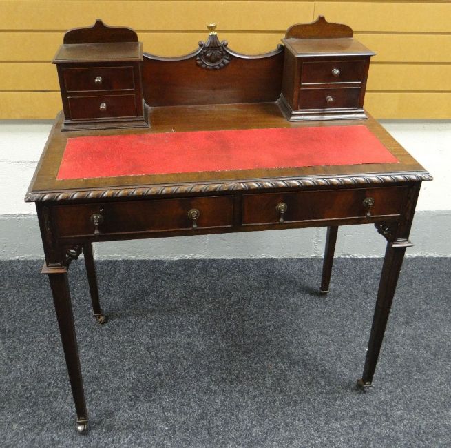 AN EDWARDIAN LADY'S MAHOGANY WRITING DESK having a single long drawer to the base and with upper stage