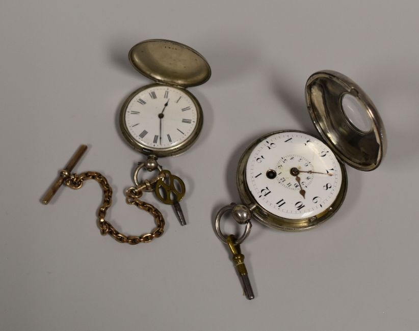 A GEORGE III SILVER HALF-HUNTER POCKET WATCH having a verge and fusee movement inscribed Thos. Avery, Solihull, 1819 and having a white enamel dial bearing Arabic numerals; together with a smaller full-hunter silver pocket-watch