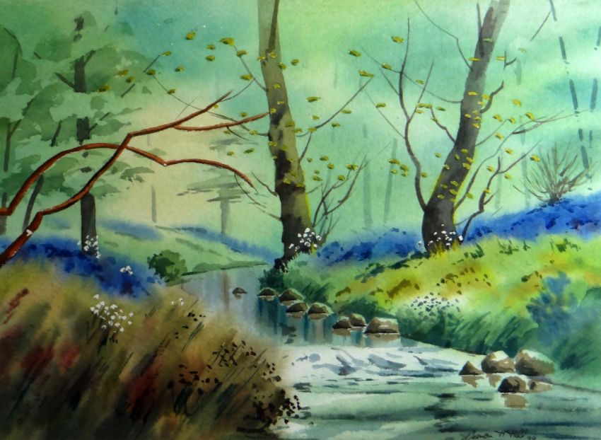 VERNON H HILL watercolour - stream running through woodland, signed and dated '99, 26 x 35cms