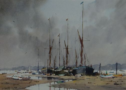 SIDNEY CARDEW watercolour - moored boats on sand banks, entitled verso 'Cluster of Barges', signed, 27 x 37cms