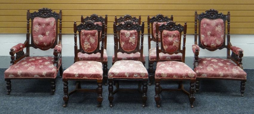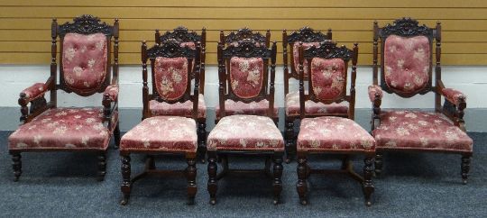 A CARVED MAHOGANY & UPHOLSTERED DRAWING ROOM SUITE OF EIGHT comprising two open armchairs and six smaller chairs, all with pink floral seats and backs