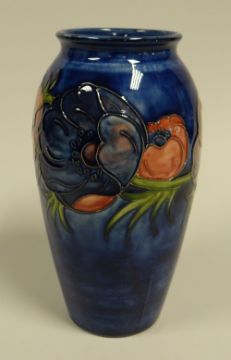 A MOORCROFT ANEMONE BALUSTER VASE in blue ground with a necklace of tube-lined flowers with 'Potters to the Late Queen Mary' label, 18cms high