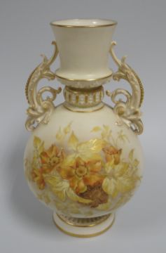A ROYAL WORCESTER TWIN HANDLED VASE raised on a circular base, with tapered neck to the ovoid body and with elaborate naturalistic handles, the body painted and gilded with flowers and leaves, date mark for 1867, 26cms high