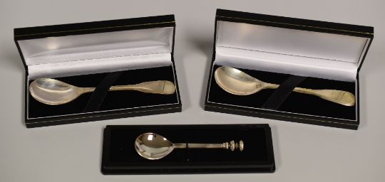 A PAIR OF ELIZABETH II SILVER SPOONS & A REPLICA 'SEAL' SPOON