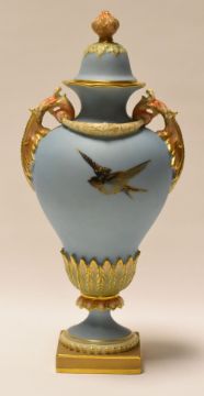 A ROYAL WORCESTER VASE DECORATED BY CHARLES BALDWYN with cover and painted with four swans in flight on powder-blue ground and with single small bird to the reverse, signed, date mark for 1903, 23cms high