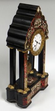A FRENCH TORTOISE SHELL & ORMOLU MANTEL CLOCK of architectural form with white enamel dial bearing Roman numerals over a decorative cameo-style pendulum, inscribed LEROY A PARIS and the back-plate stamped with the same and serial number 1356, 56cms high
