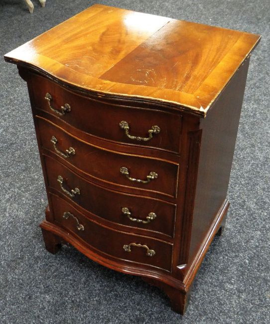 A REPRODUCTION SERPENTINE FRONT CHEST four graduated narrow drawers, 28cms wide