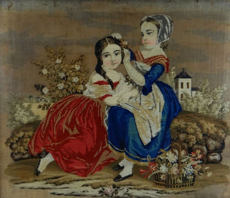 FRAMED TAPESTRY young country girl attaching flowers to the hair of another young girl with gathered flowers in basket in foreground, 51 x 60cms