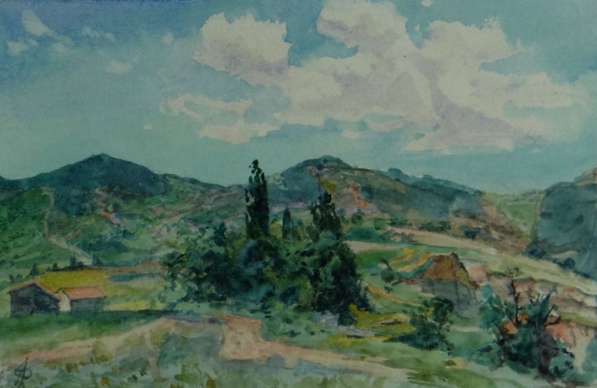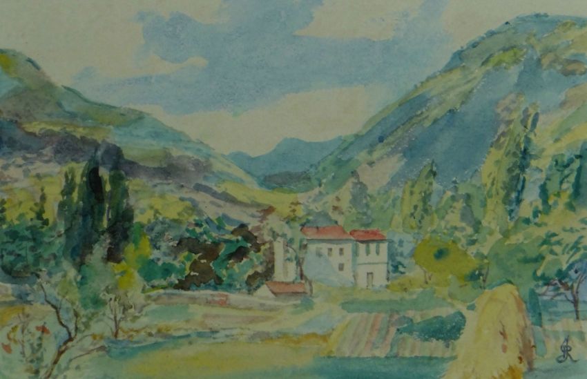 UNKNOWN two early twentieth century watercolours - farm buildings and mountains in Provence, signed with initials 'J.R', 13 x 21cms