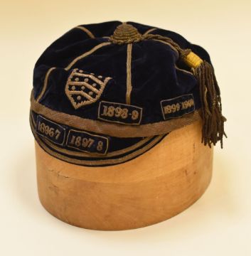 A GLOUCESTER RUGBY UNION CAP with four season dates applied being 1896-7, 1897-8, 1898-9, 1899-1900