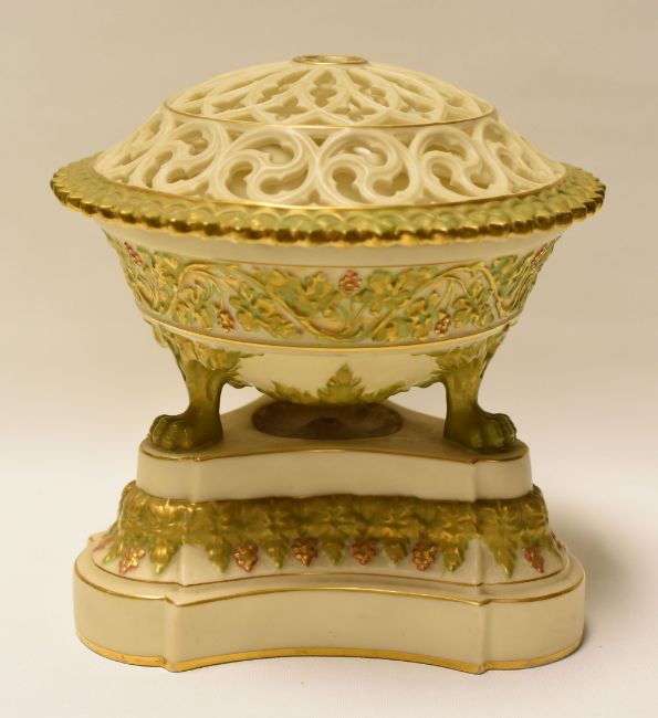 A ROYAL CHINA WORKS GRAINGER WORCESTER POT-POURRI & COVER raised on three claw feet over a shaped triangular base, 22cms high