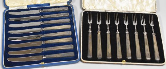 A CASED SET EIGHT SILVER HANDLE TEA-KNIVES & SIMILAR SET OF FORKS