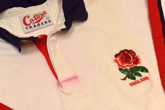 AN ENGLAND INTERNATIONAL RUGBY JERSEY MATCH-WORN BY JONATHAN WEBB V WALES 1993 AT CARDIFF some dirt marks, bears stitched No.15, Cotton Traders label internally, the game played at Cardiff Arms park was a tight affair with the underdogs Wales winning 10-9 Provenance: presented to Llandaff North RFC by Wales International Mike Rayer who was Webb's opposite number in this game. Mike Rayer has a long association with the Llandaff North rugby club as a former player, his father was club-captain and their family home was immediately outside the ground