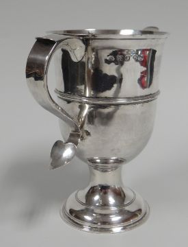 A SILVER TWIN-HANDLED GOBLET, London 1807, 12.5ozs having reeded bands, spreading foot and with attractive s-shaped handles with heart shaped terminal and with interesting later maritime military inscription to the body as follows; 'Owen`s School, Islington, Presented by the friends and neighbours of Midshipman Donald A Gyles RNVR in honour of his gallant conduct while serving on HMS Broke in the action of April 20th 1917` For his stirling efforts Gyles and other of the crew received the Distinguished Service Cross. He took charge on the forecastle and although wounded in the eyes, organised a gun`s crew from the survivors of the crews which had suffered heavy casualties and kept the guns on the forecastle going. He repelled the German sailors who swarmed on board from the destroyer which was rammed and remained at his post until after the action was finished.