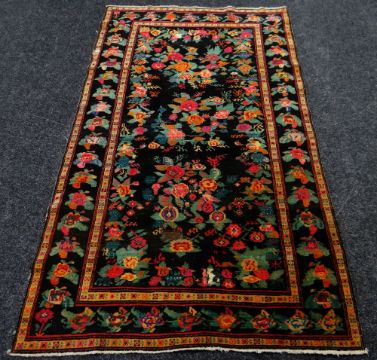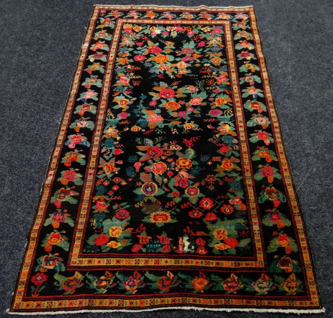 AN ANTIQUE PERSIAN CARPET of black ground with floral decoration, 233 x 130cms