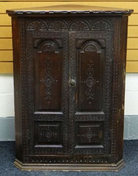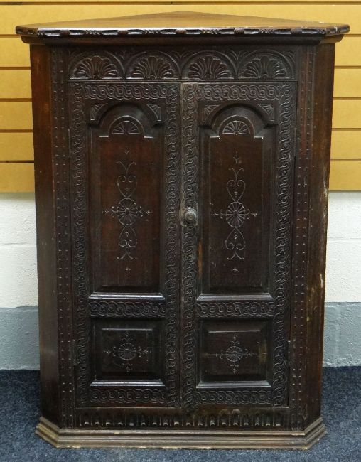 AN EARLY NINETEENTH CENTURY CARVED OAK CORNER CUPBOARD composed of two unglazed doors decorated with incised anthemion and symmetry, the interior with shaped shelving and two drawers, 90cms wide