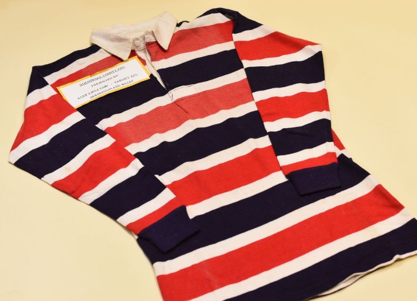 A GLAMORGAN COUNTY RUGBY UNION JERSEY hooped without crest, stitched panel No.14 to the reverse, bearing label for Lyn King Provenance: Llandaff North Rugby Sports& Social Club Ltd
