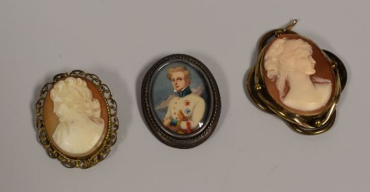 TWO CAMEO BROOCHES & A PORTRAIT MINIATURE BROOCH