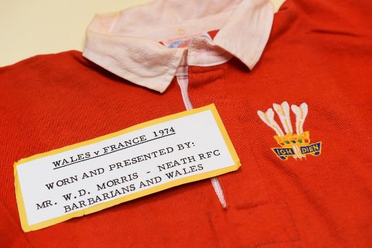 A WALES INTERNATIONAL RUGBY UNION JERSEY 'WORN & PRESENTED BY W.D MORRIS, V FRANCE 1974', bearing stitched crest and No.6 to reverse, Dai 'The Shadow' Morris was voted into an all-time greatest Wales XV rugby side as blindside-flanker, he gained 34 caps between 1967 and 1974 scoring six tries, he was one of Neath RFC's greatest servants playing 414 times. Dai Morris is somewhat of a South Wales working class folk-hero and was said to have worked shifts in the coal mine in the morning and turned-out for his country in the afternoon. 'The Shadow' it is said, is the one of the most hardworking, sensitive and modest Welsh rugby legends Provenance: Llandaff North Rugby Sports& Social Club Ltd