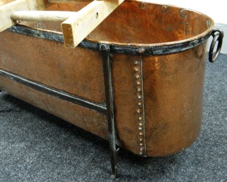 AN ANTIQUE BEATEN & RIVETED COPPER BATH raised on a mounted iron frame with ring handles and including an oversize brick of soap and a pine step, 156cms long
