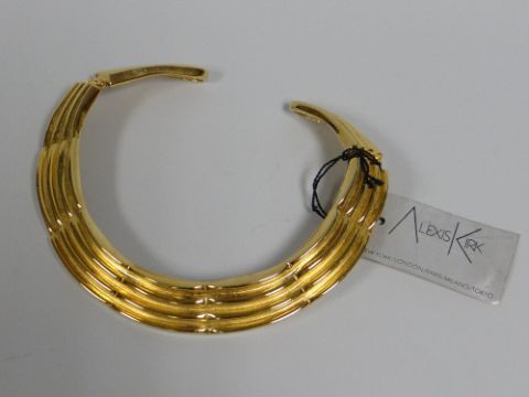 AN ALEXIS KIRK (1936-2010) DESIGNED YELLOW METAL TRIBAL-STYLE HINGING NECKLACE with label