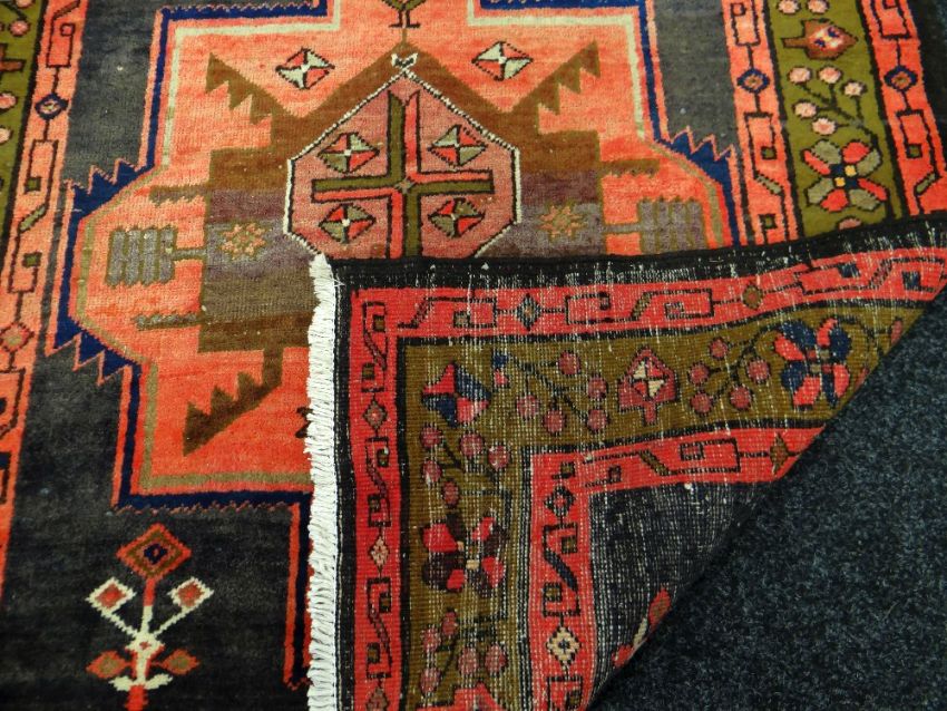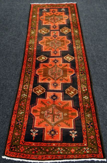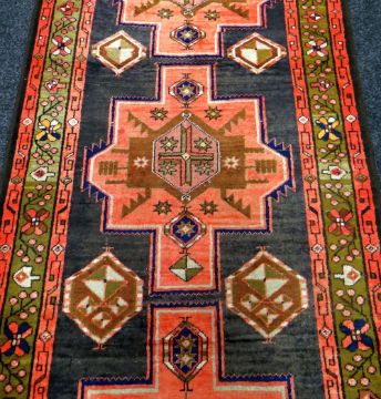 A BLACK GROUND CERISE PINK DOOR DESIGN IRANIAN RUNNER, 335 x 105cms