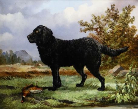 A WORTHINGTON oil on canvas - portrait of a long haired black retriever with pheasant on moorland, signed 'A. Worthington, 1870' with inscription verso, 50 x 62cms