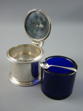 A HALLMARKED SILVER MUSTARD POT, maker's mark for Charles Thomas and George Fox, London 1854, 4.8 troy ozs weighable with blue glass liner and non-associated EPNS mustard spoon, drum shaped with gadrooned edges, scroll handle with thumbpiece and crest engraved lid, 7 cms high