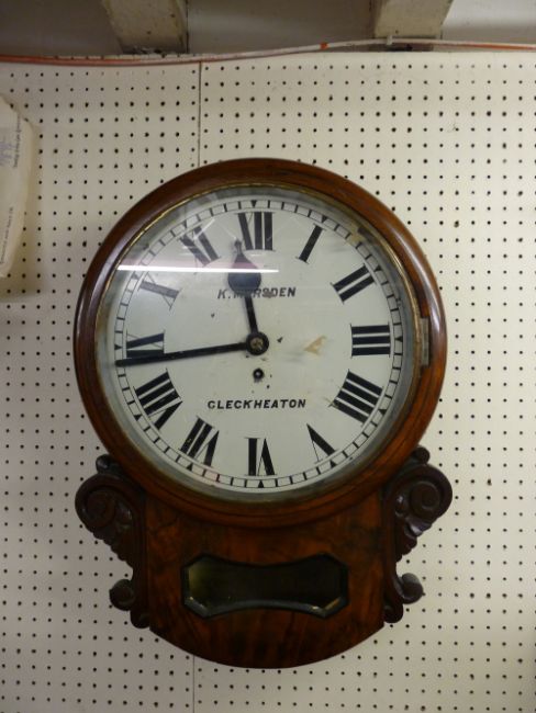 A 19th CENTURY WALNUT CASED DROP DIAL WALL CLOCK, single fusee movement with pendulum and key, the dial set with Roman numerals, maker 'K Marsden, Cleckheaton', 50 cms high, 38 cms diameter