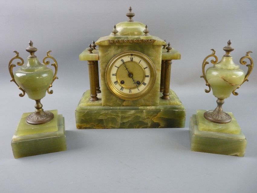 A FRENCH ONYX AND GILT METAL CLOCK GARNITURE, architectural style timepiece with acorn finials and dial flanking reeded columns, white enamel outer dial set with Roman numerals, twin wind pendulum movement striking on a gong, raised on a rectangular base, the garniture with ornamental metal mounted onyx urns on stepped square bases, 31 x 29 cms the clock