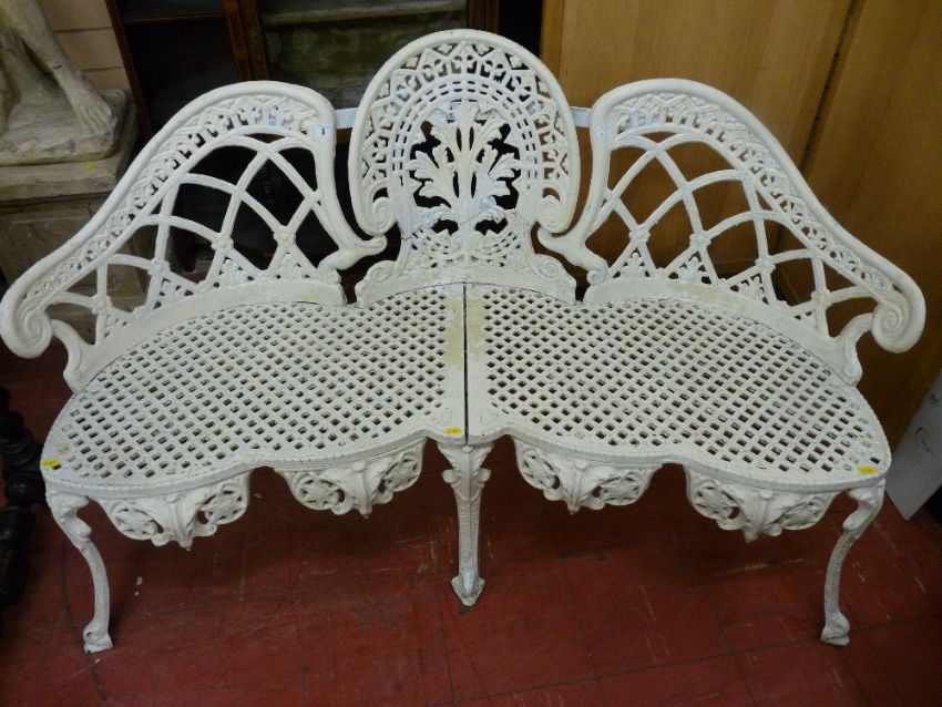 A VICTORIAN CAST IRON GARDEN BENCH, cameo back in style with lattice seat and decorative apron on six supports, 85.5 x 139 cms (repaired break to back centre section)