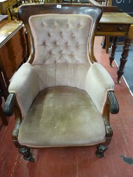 A VICTORIAN ROSEWOOD BUTTON BACK UPHOLSTERED ARMCHAIR, 94 cms high, 65 cms wide