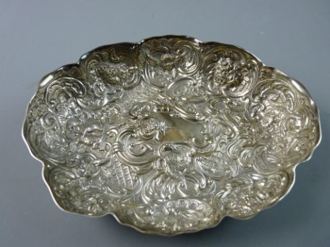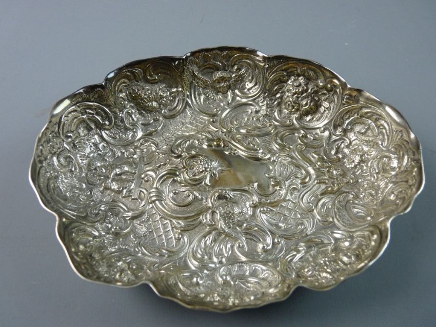 AN OVAL SILVER DISH with all over raised decoration, scrolls, animals, fruit and angelic masks etc, 4.5 troy ozs, London 1905