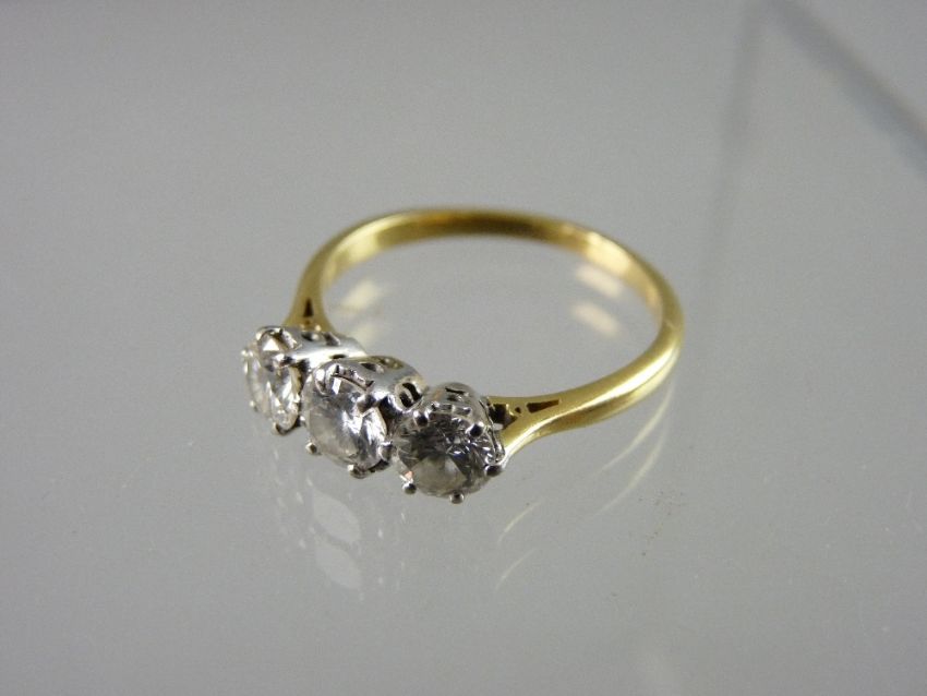 AN EIGHTEEN CARAT GOLD THREE STONE DIAMOND RING, claw set round brilliant cut stones with a combined estimate of 1.55 carats, good clarity and colour, 3.5 grms gross approximate, size Q