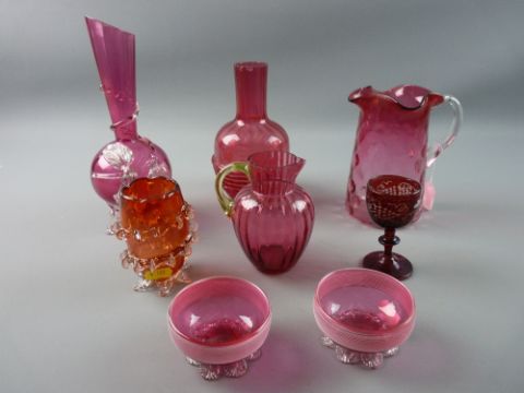 A PARCEL OF CRANBERRY GLASSWARE including a pair of circular white lined salts on plain supports, two jugs, a carafe, a narrow necked vase and a small bowl etc (damaged areas to some pieces)