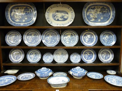 A QUANTITY OF WILLOW PATTERN BLUE AND WHITE DINNERWARE as displayed on the dresser (Lot 50), to include to meat platters, two tureens with covers, eighteen various size plates, a drainer and seven other pieces in varying patterns